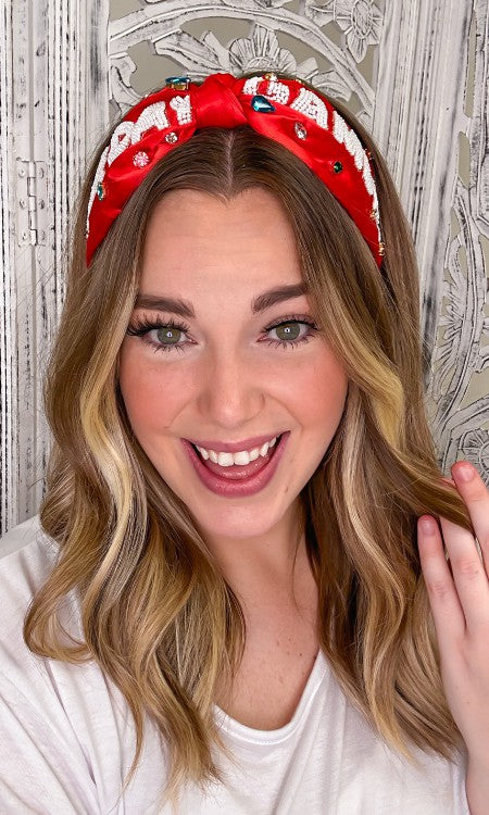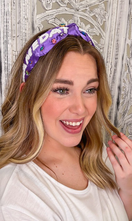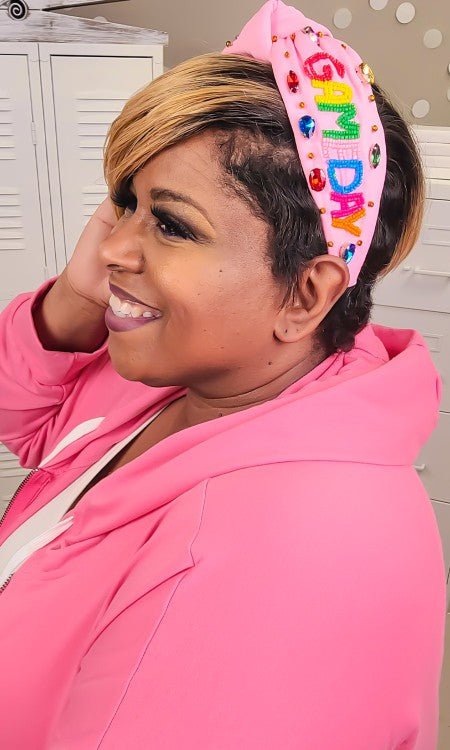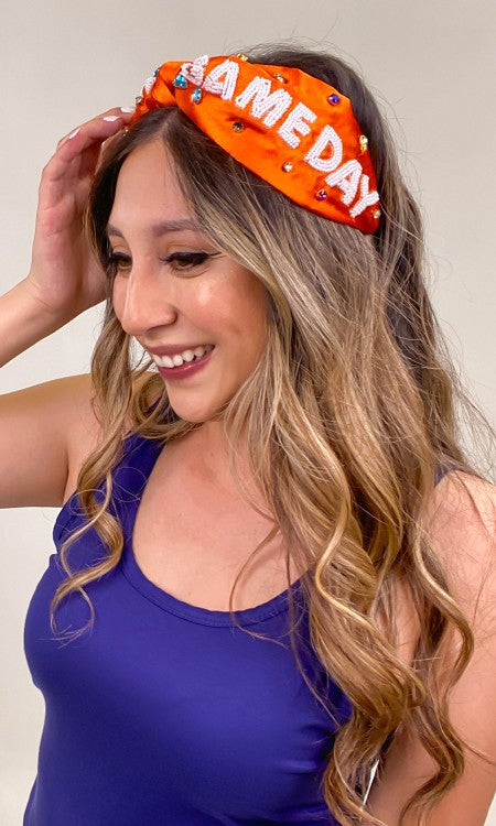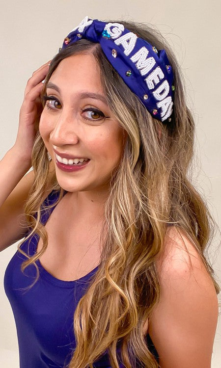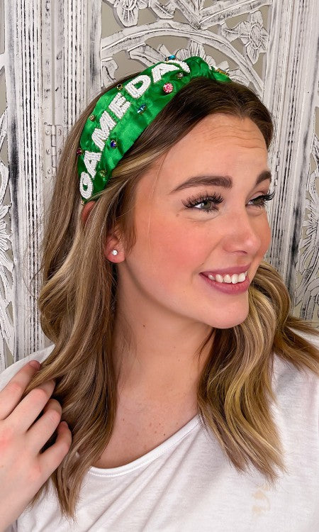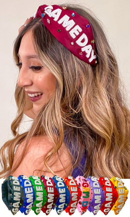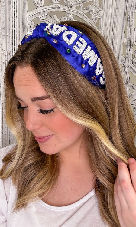 Trendy headband features a solid color band with beaded GAMEDAY on both sides with jewels throughout the headband. Headband is available in various different colors.