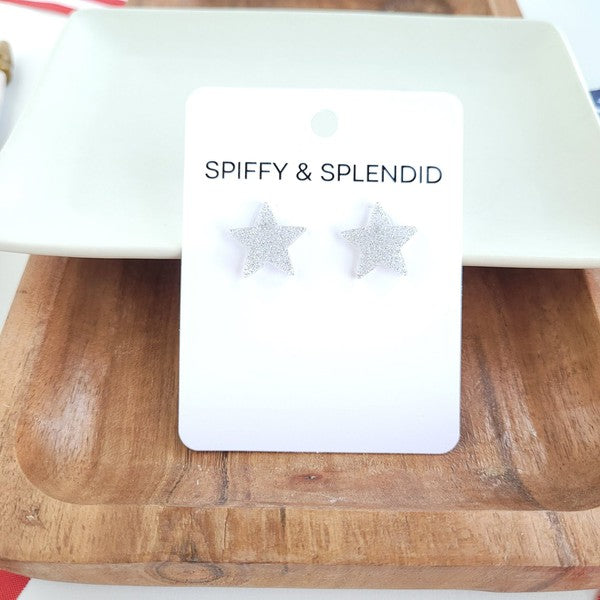 Shine bright with our Liberty Star Studs! Perfect for adding some sparkle to the Fourth of July or any day, these studs will make you the star of the show! Hypoallergenic stainless-steel posts 18mm star size Lightweight and durable sparkle acrylic.