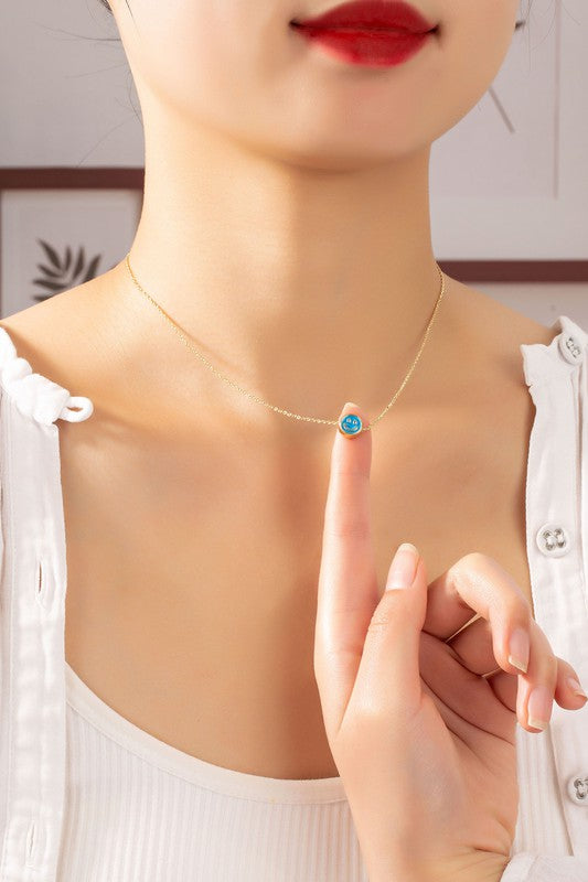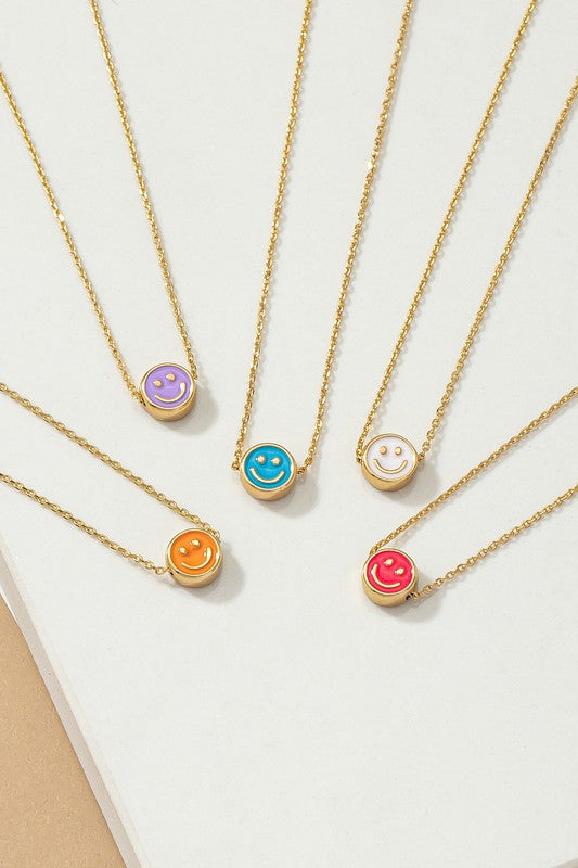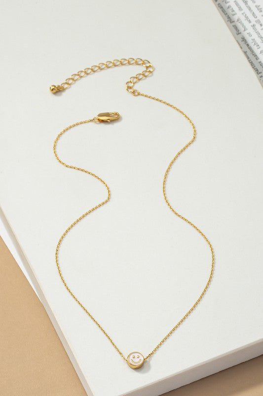 Mini smiley face pendant on a delicate chain necklace. Made of iron, alloy and enamel. Shiny gold plating.