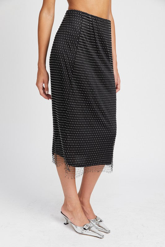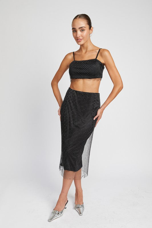 Our Rhinestone Mesh Midi Skirt length is just under the knees, sheer in fabric and stretchy waist. Pairs perfectly with the matching tank sold seperately.