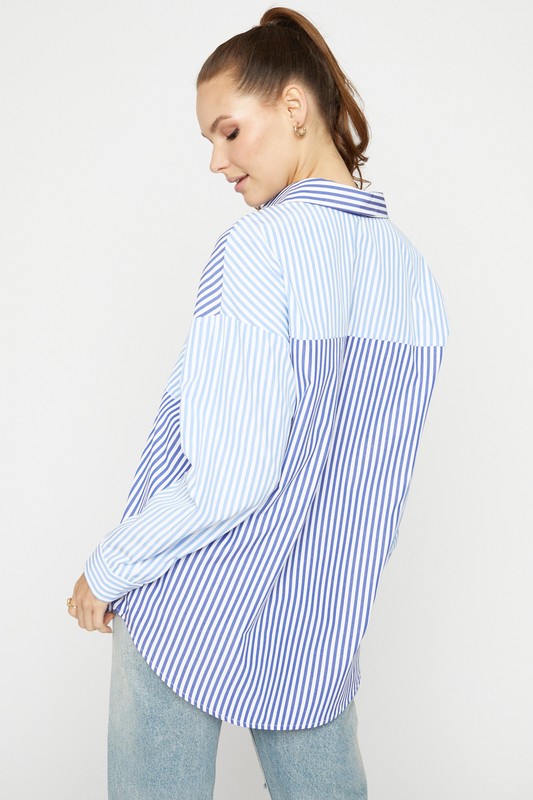 This color blocked striped button down is our personal favorite.  Back in stock with limited availability.  Polyester and Cotton Blend.