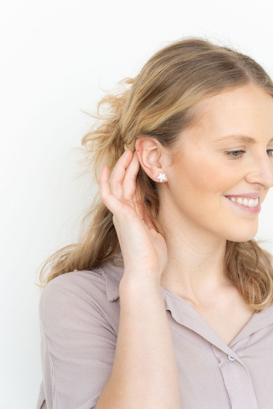 Our Star Studs are our classic dainty star-shaped stud earrings featuring a pearly white color that can be worn for patriotic festivities or all year long.