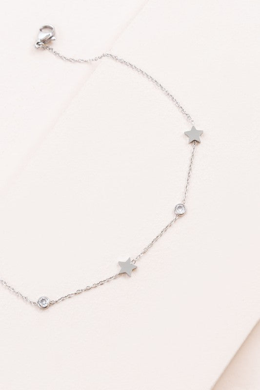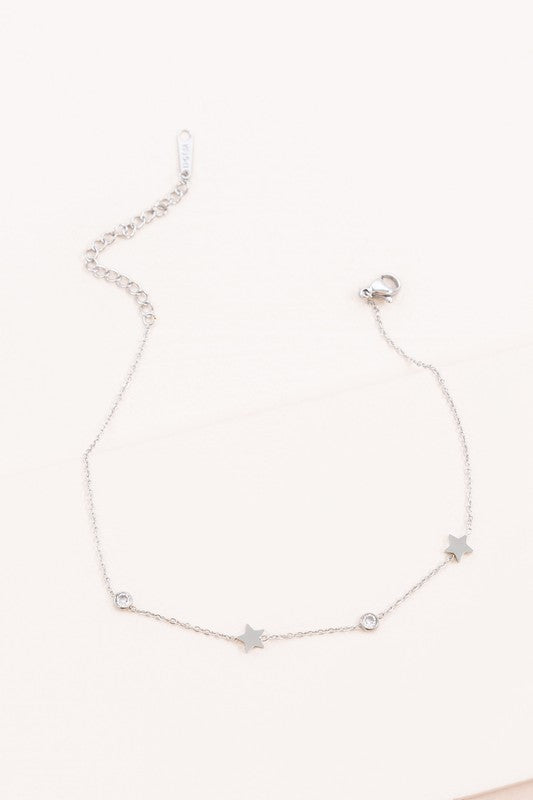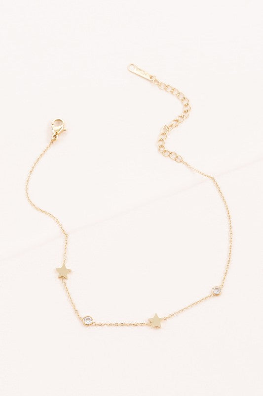 Dainty chain anklet with rhinestones and stars ! 14 k Gold Plated Stainless steel Measurements : Length : 22 cm / 8.66 in Extension Chain : 28.1 cm / 11.06 in