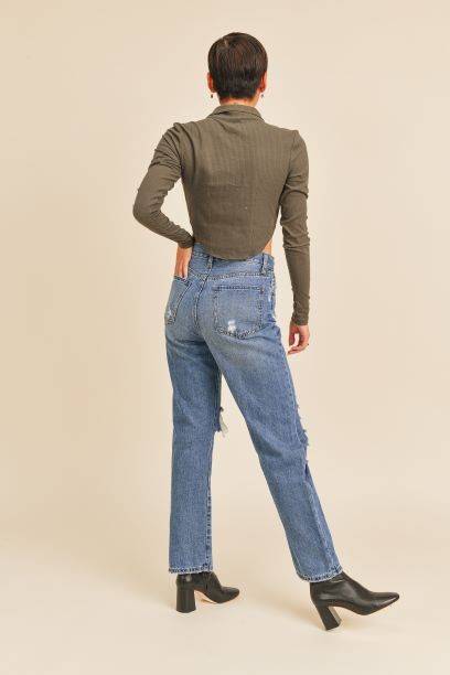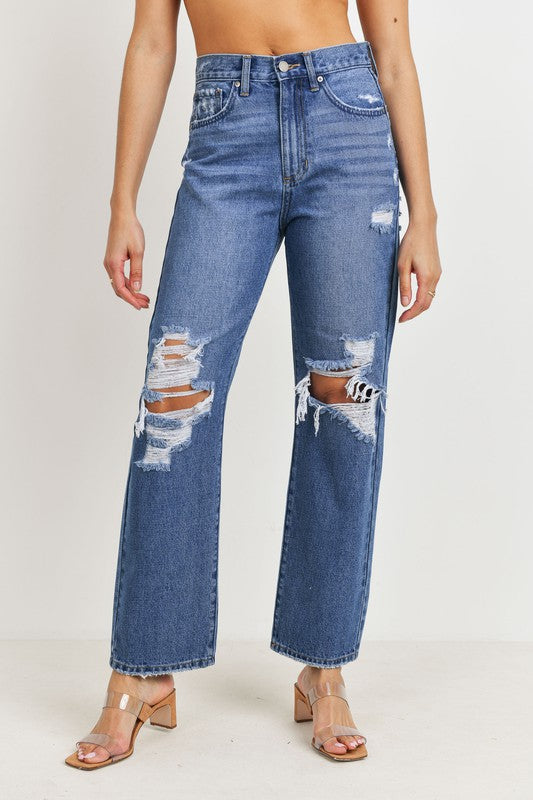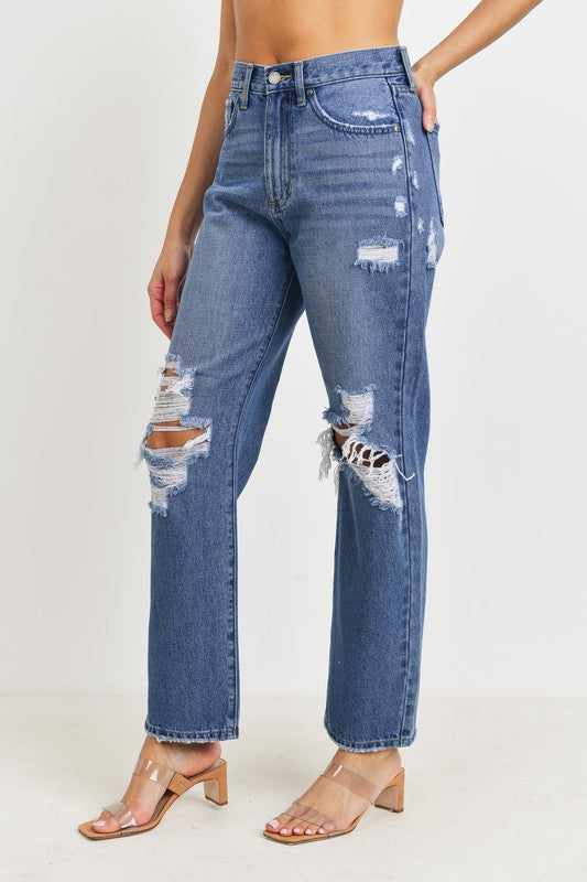 High rise full length distressed straight dad jeans in medium wash denim non-stretch 11 1/2'' Rise, 29'' Inseam, 8'' Opening
