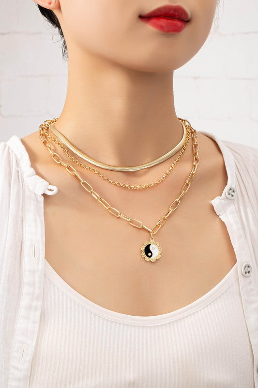 Three row herringbone chain choker and Yin Yang pendant necklace. Made of brass chain and alloy pendant. shiny gold plating.